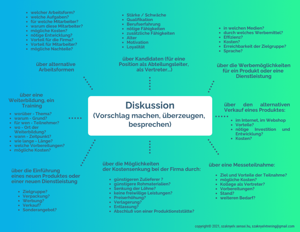 A vita magában foglalhatja, hogy a vizsgán meg kell győznöd a beszélgetőpartnered, vagy javaslatot kell tenned valamire, vagy csak egyszerűen meg kell beszélned valamit egy kollégáddal. A térképen összegyűjtöttem a leggyakrabban előforduló vita-szituációk témáját. Ezek alapján és a már megszerzett ismeretek alapján (szakmai társalgásra való felkészülés közben) be lehet gyakorolni, hogy például milyen érvekkel tudod meggyőzni a főnököt, hogy vezessék be a cégnél a homeoffice munkarendet, vagy mivel támaszd alá azt a javaslatodat, hogy interneten reklámozzon a céged, vagy milyen szempontokat vegyél figyelembe, ha egy továbbképzést kell egy kollégával megszervezned.