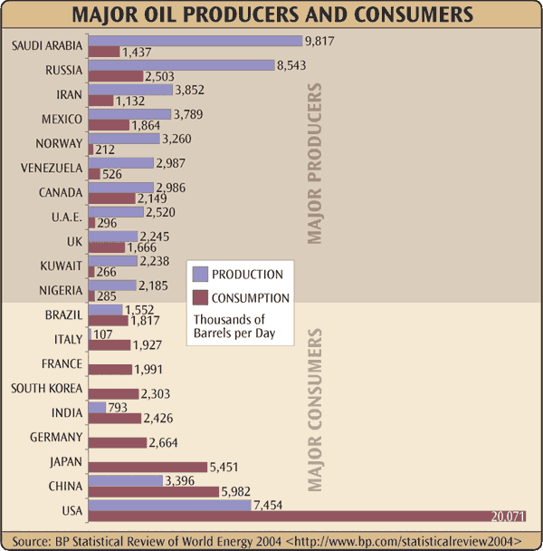 This bulk graph _________________ about the major oil producers and consumers.